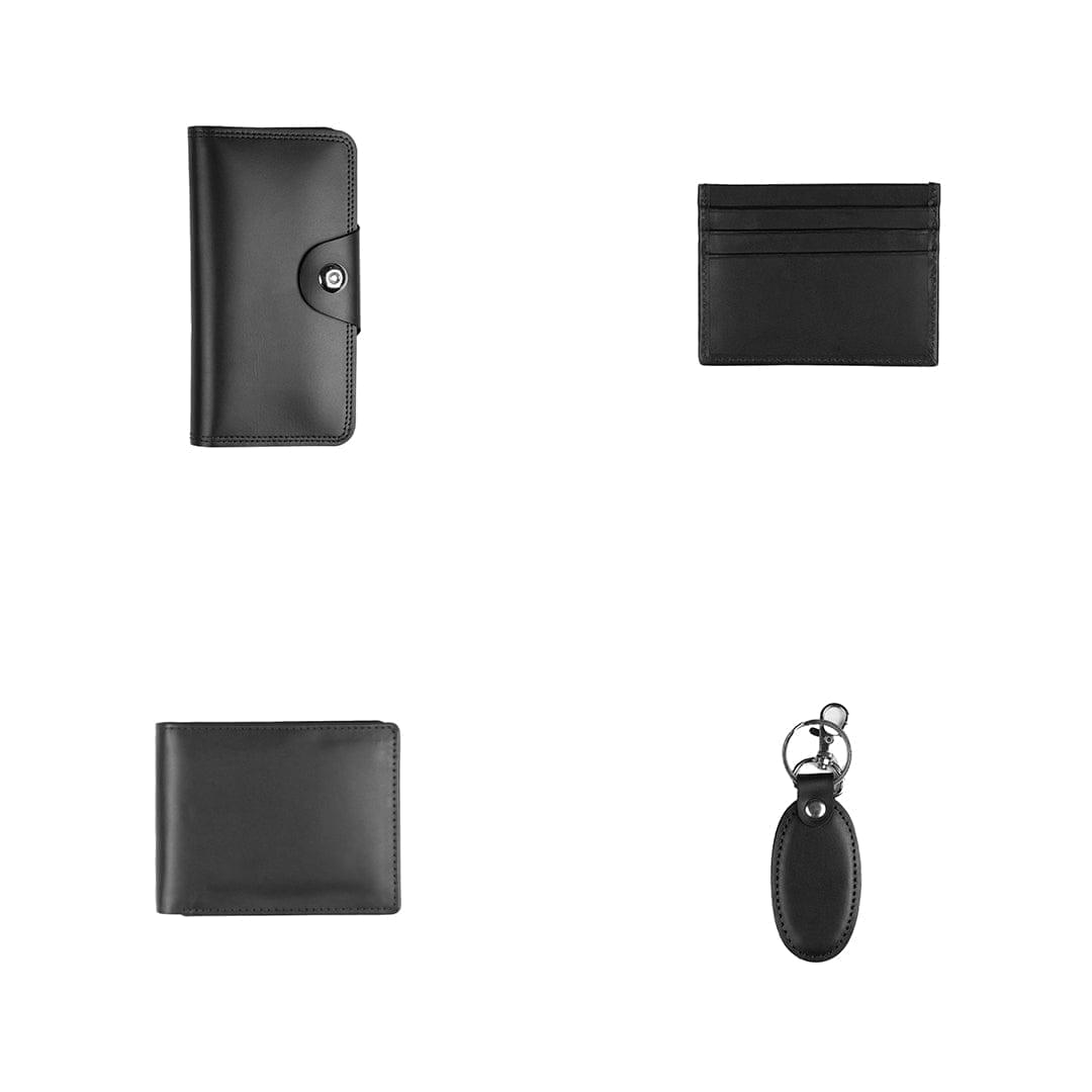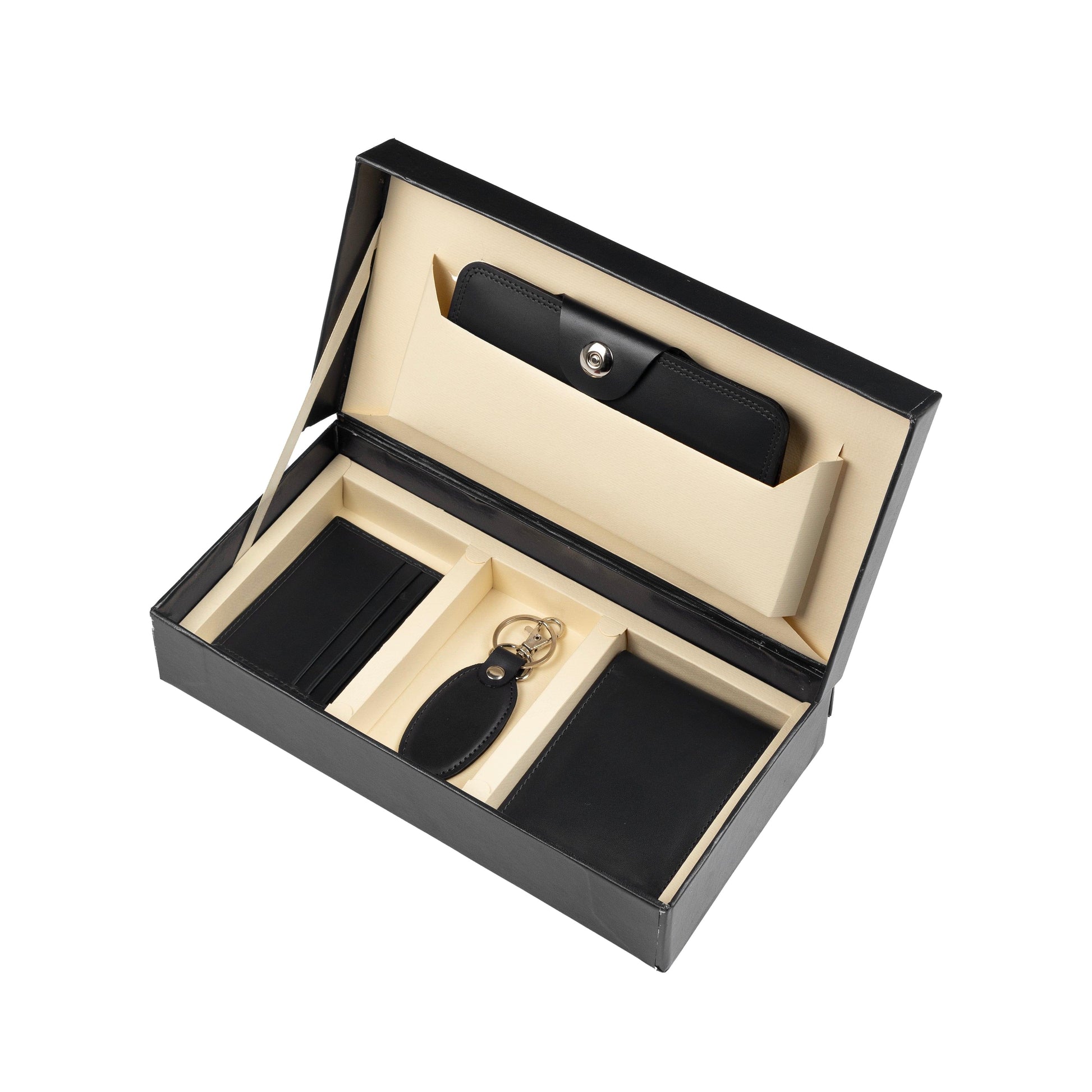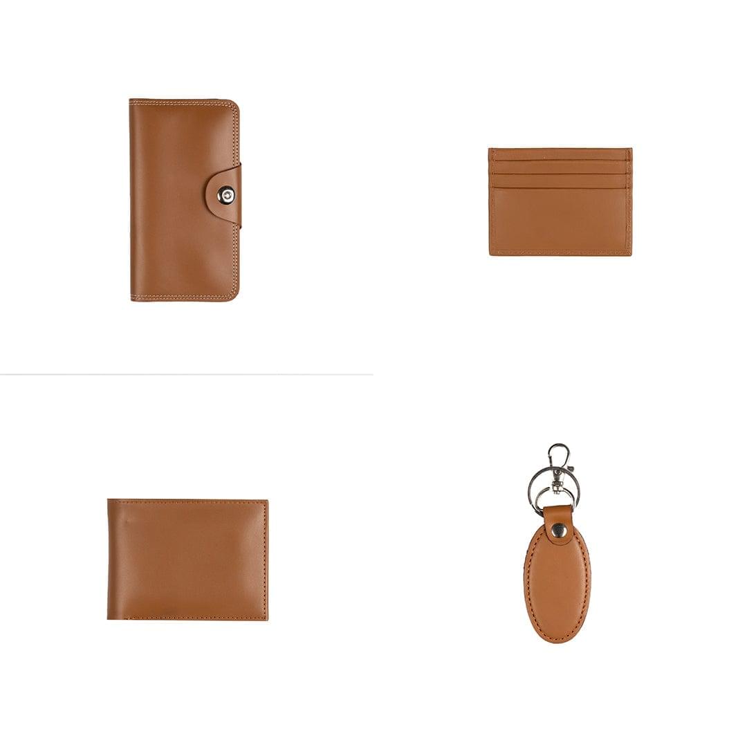 Introducing our 4-piece box set, the perfect accessory collection for any stylish and practical individual on the go. This set includes a sleek leather card holder, a classic wallet with ample space for all your essentials, a versatile travel pouch for your travel needs and a stylish keychain to keep your keys organized. Each piece is crafted from high-quality leather with attention to detail and durability in mind. With this set, you'll have everything you need to keep your essentials organized and within reach.